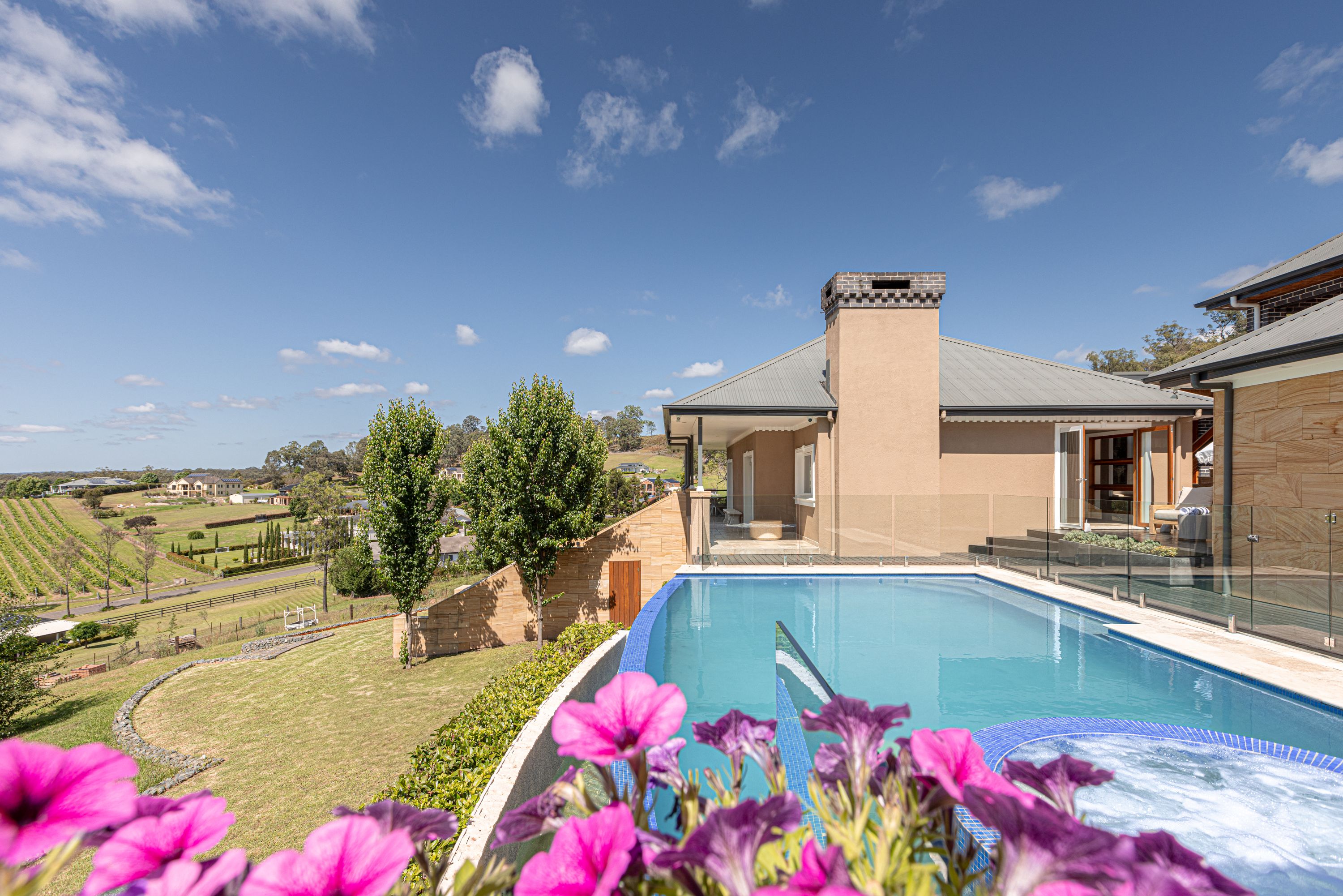 Outdoor entertaining is a dream with a raised timber deck, paved terraces, and multiple seating areas overlooking the infinity pool and surrounding vineyard. A resort-style infinity pool and spa, perfect for cooling off or enjoying a dip in the evening!