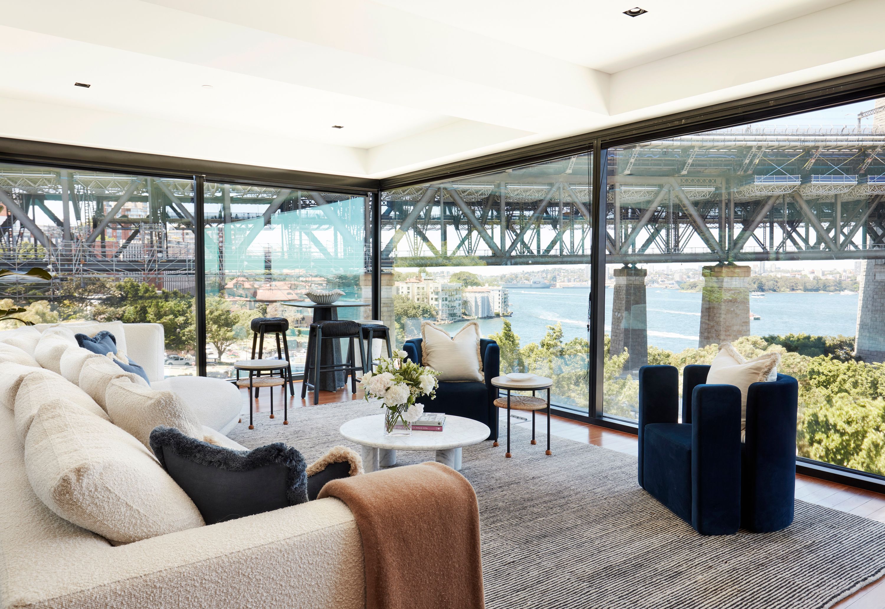 The showstopper here is the main living area, with floor-to-ceiling windows revealing a truly breathtaking panorama of the colossal bridge, the deep blue Harbour, the finger wharves across the water and the Sydney skyline in the background. It’s hard to say when this space is at its best – it looks equally gorgeous in the bright light of day, twinkling in the darkness of night or lit by horizontal rays at sunrise or sunset.
